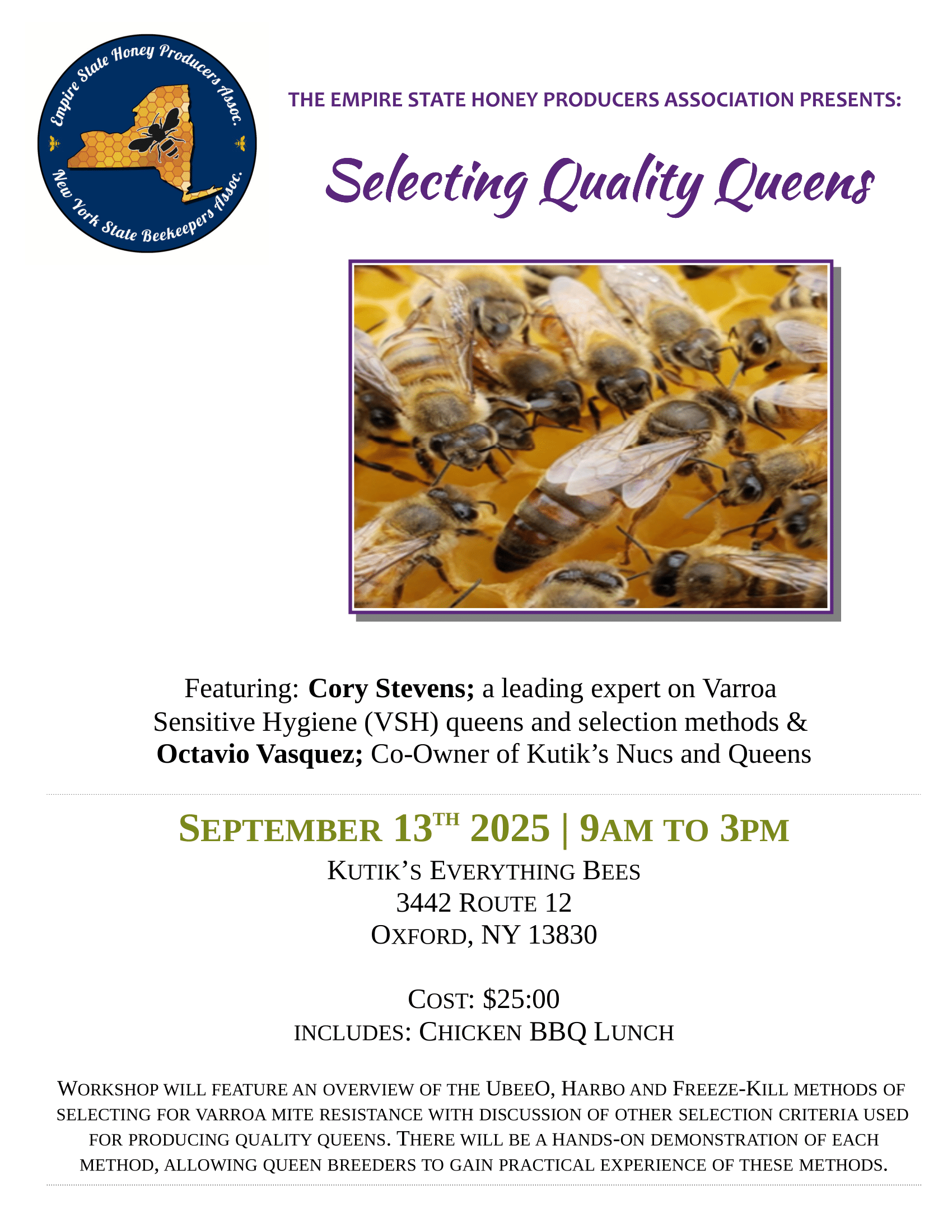 Selecting Quality Queens *** Preregistration Required Saturday, September 13, 2025 9:00 AM 3:00 PM 09:00 15:00 Kutik's Everything Bees LLC 3442 New York 12 Oxford, NY, 13830 United States (map) Google Calendar ICS With Cory Stevens & Octavio Vasquez